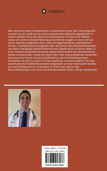 Wer einmal in einem Krankenhaus in Deutschland oder den USA behandelt worden ist, der weiß um die vielen suboptimalen Behandlungsabläufe. In beiden Ländern sind seit Jahren Krankenhäuser im Fokus der Medien, wobei vor allem in Deutschland kaum ein Monat vergeht, in dem nicht ein neuer Skandal aufgedeckt wird, seien es Hygienedefizite, unterbesetzte Stellen, Transplantationsvergehen oder ähnliches. Das Krankenhauswesen und damit das ganze System scheint krank. Dieses Buch versucht dabei, in einer Vielzahl an Einzeleindrücken, diesen Sachverhalt von verschiedenen Seiten zu beleuchten, wobei der Autor als in den USA arbeitender deutscher Arzt aus einer Innen- als auch Außenschau das Krankenhauswesen betrachtet. Es wird zu einem Teil das deutsche, zu einem anderen Teil das amerikanische Krankenhauswesen dargestellt und der Autor greift hierbei auf seinen Blog zurück, in welchem er schon seit Jahren das Gesundheitswesen und damit die Krankenhäuser beider Länder beobachtet.