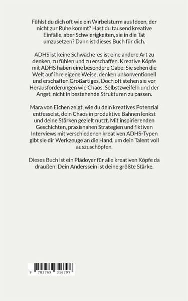 Fühlst du dich oft wie ein Wirbelsturm aus Ideen, der nicht zur Ruhe kommt? Hast du tausend kreative Einfälle, aber Schwierigkeiten, sie in die Tat umzusetzen? Dann ist dieses Buch für dich. ADHS ist keine Schwäche es ist eine andere Art zu denken, zu fühlen und zu erschaffen. Kreative Köpfe mit ADHS haben eine besondere Gabe: Sie sehen die Welt auf ihre eigene Weise, denken unkonventionell und erschaffen Großartiges. Doch oft stehen sie vor Herausforderungen wie Chaos, Selbstzweifeln und der Angst, nicht in bestehende Strukturen zu passen. Mara von Eichen zeigt, wie du dein kreatives Potenzial entfesselst, dein Chaos in produktive Bahnen lenkst und deine Stärken gezielt nutzt. Mit inspirierenden Geschichten, praxisnahen Strategien und fiktiven Interviews mit verschiedenen kreativen ADHS-Typen gibt sie dir Werkzeuge an die Hand, um dein Talent voll auszuschöpfen. Dieses Buch ist ein Plädoyer für alle kreativen Köpfe da draußen: Dein Anderssein ist deine größte Stärke.