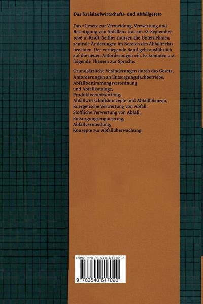 Das 'Gesetz zur Vermeidung, Verwertung und Beseitigung von Abfällen' trat am 28.9.1996 in Kraft. Seither müssen die Unternehmen zentrale Änderungen im Bereich des Abfallrechts beachten. Der vorliegende Band geht ausführlich auf die neuen Anforderungen ein. Es kommen u.a. folgende Themen zur Sprache: Grundsätzliche Veränderungen durch das Gesetz, Anforderungen an Entsorgungsfachbetriebe, Abfallbestimmungsverordnung und Abfallkataloge, Produktverantwortung, Abfallwirtschaftskonzepte und Abfallbilanzen, Energetische Verwertung von Abfall, Stoffliche Verwertung von Abfall, Entsorgungsengineering, Abfallvermeidung, Konzepte zur Abfallüberwachung.