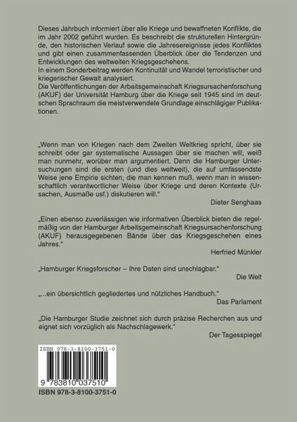 Das Jahrbuch informiert über alle im Jahr 2002 ausgetragenen Kriege und bewaffneten Konflikte. Die Daten und Definitionen der AKUF bilden die im deutschen Sprachraum meisterverwendete Grundlage einschlägiger Publikationen.