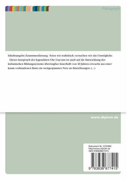 Magisterarbeit aus dem Jahr 2003 im Fachbereich Pädagogik - Erwachsenenbildung, Note: 1,0, Universität Leipzig (Erziehungswissenschaften), Sprache: Deutsch, Abstract: Inhaltsangabe:Zusammenfassung: Seien wir realistisch, versuchen wir das Unmögliche. Dieser Ausspruch des legendären Che Guevara ist auch auf die Entwicklung des kubanischen Bildungssystems übertragbar. Innerhalb von 40 Jahren erwuchs aus einer kaum vorhandenen Basis ein weitgespanntes Netz an Einrichtungen. In diesem Sinne ist für ein Entwicklungsland tatsächlich fast Unmögliches gelungen: Kuba muss sich hinsichtlich des Bildungsstandes seiner Bürger nicht hinter den westlichen Industriestaaten verstecken. Das hat sich bis zum jetzigen Tag nicht geändert. Während jedoch in den ersten 30 Jahren nach der Revolution die sozialistischen Länder tatkräftige Unterstützung leisteten, ist Kuba heute auf sich allein gestellt.