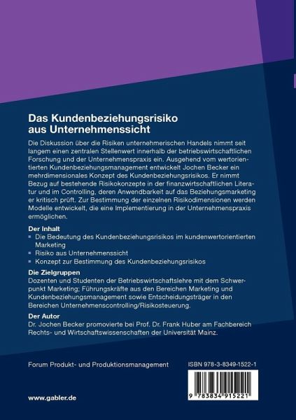 Die Diskussion über die Risiken unternehmerischen Handels nimmt seit langem einen zentralen Stellenwert innerhalb der betriebswirtschaftlichen Forschung und der Unternehmenspraxis ein. Ausgehend vom wertorientierten Kundenbeziehungsmanagement entwickelt Jochen Becker ein mehrdimensionales Konzept des Kundenbeziehungsrisikos. Er nimmt Bezug auf bestehende Risikokonzepte in der finanzwirtschaftlichen Literatur und im Controlling, deren Anwendbarkeit auf das Beziehungsmarketing er kritisch prüft. Zur Bestimmung der einzelnen Risikodimensionen werden Modelle entwickelt, die eine Implementierung in der Unternehmenspraxis ermöglichen.