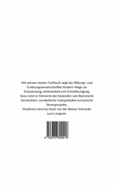 Mit dem Buch "Das kunterbunte Schneckenhaus" wird Kindern die Möglichkeit angebotene, für sich Wege zur Entspannung, Achtsamkeit und Entschleunigung zu finden.Dazu nutzt der Autor Elemente des Snoezelen wie illuminierte Geschichten, musikalische Farbspektakel und lyrische Sinnesprojekte. Moderiert wird das Buch von der kleinen Schnecke Luna Langsam. Sie ist sowohl die Protagonistin der Geschichten, Verse und Aktionen, als auch das Sinnbild für diese, hier angebotene Art der Entschleunigung. Das Praxisbuch "Das kunterbunte Schneckenhaus" richtet sich an Kinder im Vorschul- und frühem Grundschulalter und findet seine Anwendung in Kindertageseinrichtungen, Grundschulen und zu Hause.