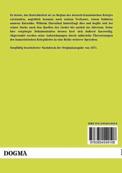 Es heisst, das Kutschkelied sei zu Beginn des deutsch-französischen Krieges entstanden, angeblich benannt nach seinem Verfasser, einem Soldaten namens Kutschke. Wilhelm Ehrenthal hinterfragt dies und begibt sich bei seiner Suche nach den Quellen des Liedes bis zurück ins Altertum. Seine hier vorgelegte Dokumentation dessen liest sich äußerst kurzweilig. Abgerundet werden seine Aufzeichnungen durch zahlreiche Übersetzungen des humoristischen Kriegsliedes in eine Reihe weiterer Sprachen.