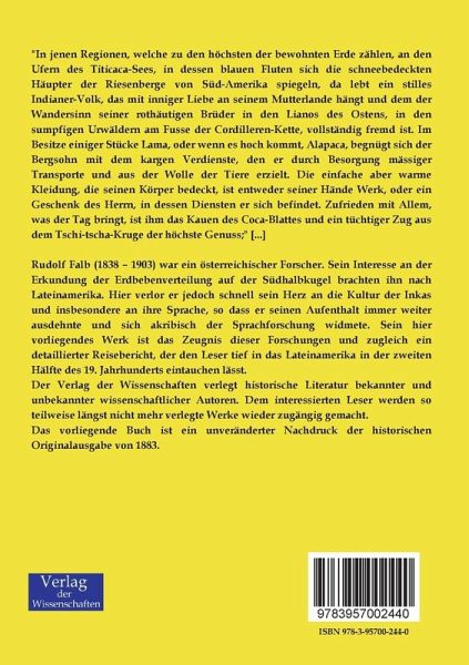 Rudolf Falb (1838 1903) war ein österreichischer Forscher. Sein Interesse an der Erkundung der Erdbebenverteilung auf der Südhalbkugel brachten ihn nach Lateinamerika. Hier verlor er jedoch schnell sein Herz an die Kultur der Inkas und insbesondere an ihre Sprache, so dass er seinen Aufenthalt immer weiter ausdehnte und sich akribisch der Sprachforschung widmete. Sein hier vorliegendes Werk ist das Zeugnis dieser Forschungen und zugleich ein detaillierter Reisebericht, der den Leser tief in das Lateinamerika in der zweiten Hälfte des 19. Jahrhunderts eintauchen lässt.