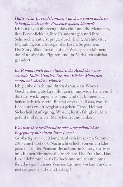 Nina George nimmt den Leser in „Das Lavendelzimmer“ mit auf eine besondere Reise in die Welt der Bücher und der Liebe hinter der wunderschönen Kulisse des südlichen Frankreichs. Auf angenehm leichte Weise sinniert die Autorin über das Leben, Ängste, Gefühle und Träume. Sympathische Romanfiguren und charmante Dialoge verzaubern den Leser und lassen ihn oftmals schmunzeln.