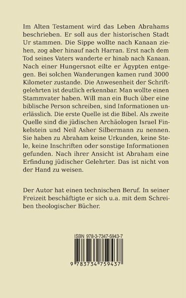 Im Alten Testament wird das Leben Abrahams beschrieben. Er soll aus der historischen Stadt Ur stammen. Die Sippe wollte nach Kanaan ziehen, zog aber hinauf nach Harran. Erst nach dem Tod seines Vaters wanderte er hinab nach Kanaan. Nach einer Hungersnot eilte er Ägypten entgegen. Bei solchen Wanderungen kamen rund 3000 Kilometer zustande. Die Anwesenheit der Schriftgelehrten ist deutlich erkennbar. Man wollte einen Stammvater haben. Will man ein Buch über eine biblische Person schreiben, sind Informationen unerlässlich. Die erste Quelle ist die Bibel. Als zweite Quelle sind die jüdischen Archäologen Israel Finkelstein und Neil Asher Silbermann zu nennen. Sie haben zu Abraham keine Urkunden, keine Stele, keine Inschriften oder sonstige Informationen gefunden. Nach ihrer Ansicht ist Abraham eine Erfindung jüdischer Gelehrter. Das ist nicht von der Hand zu weisen.