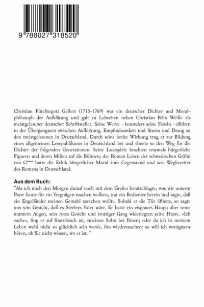 Christian Fürchtegott Gellert (1715-1769) war ein deutscher Dichter und Moralphilosoph der Aufklärung und galt zu Lebzeiten neben Christian Felix Weiße als meistgelesener deutscher Schriftsteller. Seine Werke - besonders seine Fabeln - zählten in der Übergangszeit zwischen Aufklärung, Empfindsamkeit und Sturm und Drang zu den meistgelesenen in Deutschland. Durch seine breite Wirkung trug er zur Bildung eines allgemeinen Lesepublikums in Deutschland bei und ebnete so den Weg für die Dichter der folgenden Generationen. Seine Lustspiele brachten erstmals bürgerliche Figuren und deren Milieu auf die Bühnen; der Roman Leben der schwedischen Gräfin von G*** hatte die Ethik bürgerlicher Moral zum Gegenstand und war Wegbereiter des Romans in Deutschland. Aus dem Buch: "Als ich mich den Morgen darauf noch mit dem Grafen beratschlagte, was wir unserm Paare heute für ein Vergnügen machen wollten, trat ein Bedienter herein und sagte, daß ein Engelländer meinen Gemahl sprechen wollte. Sobald er die Tür öffnete, so sagte uns sein Gesicht, daß es Steeleys Vater wäre. Er hatte ein eisgraues Haupt; aber seine muntern Augen, sein rotes Gesicht und trotziger Gang widerlegten seine Haare. »Ich suche«, fing er auf französisch an, »meinen Sohn bei Ihnen; oder da ich in meinem Leben wohl nicht so glücklich sein werde, ihn wiederzusehen: so will ich wenigstens hören, ob Sie nicht wissen, wo er ist. "