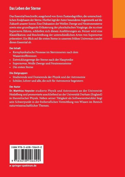 Das Essential beschreibt, ausgehend von ihren Zustandsgrößen, die unterschiedlichen Endphasen der Sterne. Hierbei legt der Autor besonderes Augenmerk auf die Zukunft unserer Sonne. Eine Diskussion der Weißen Zwerge und Neutronensterne sowie eine grundlegende Erläuterung der physikalischen Vorgänge, die zu einer Supernova führen, schließen sich diesen Ausführungen an. Ferner wird eine Klassifikation und Beschreibung der unterschiedlichen Arten von Supernovae präsentiert. Ein Blick auf die ersten Sterne in unserem frühen Universum rundet dieses Essential ab.