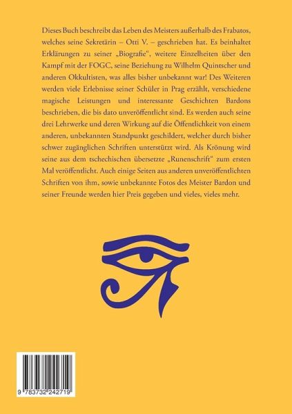 Dieses Buch beschreibt das Leben des Meisters außerhalb des Frabatos, welches seine Sekretärin - Otti V. - geschrieben hat. Es beinhaltet Erklärungen zu seiner "Biografie", weitere Einzelheiten über den Kampf mit der FOGC, seine Beziehung zu Wilhelm Quintscher und anderen Okkultisten, was alles bisher unbekannt war! Des Weiteren werden viele Erlebnisse seiner Schüler in Prag erzählt, verschiedenemagische Leistungen und interessante Geschichten Bardons beschrieben, die bis dato unveröffentlicht sind. Es werden auch seine drei Lehrwerke und deren Wirkung auf die Öffentlichkeit von einem anderen, unbekannten Standpunkt geschildert, welcher durch bisher schwer zugänglichen Schriften unterstützt wird. Als Krönung wird seine aus dem tschechischen übersetzte "Runenschrift" zum ersten Mal veröffentlicht. Auch einige Seiten aus anderen unveröffentlichten Schriften von ihm, sowie unbekannte Fotos des Meister Bardon und seiner Freunde werden hier Preis gegeben und vieles, vieles mehr.Inhalt:1. Vorwort2. Die Biographie3. Über die angeblichen Fehler in den Franz BardonWerken4. Was über Bardon anderen Ortes berichtet wurde5. Weitere Begebenheiten6. Was uns Ernst Quintscher über den Meistererzählte7. Was andere Okkultisten über Bardon geschriebenhaben8. Arianes Erlebnisse mit Meister Arion9. Verschiedene Artikel10. Kleinere Zitate1. Anhang - Runen-Magie nach Franz Bardon2. Anhang - Tschechische Übersetzungen3. Anhang - Briefauszug4. Anhang - Aus der "Okkulten Stimme"5. Anhang - Ein kurzes Interview mit dem Meister6. Anhang - Weitere Berichte7. Anhang - Unbekannte Fotos