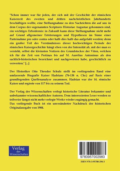 Der Historiker Otto Theodor Schulz stellt im vorliegenden Band eine umfassende Biografie Kaiser Hadrians (76-138 n. Chr.) auf Basis einer grundlegenden Quellenanalyse zusammen. Hadrian war der 14. römische Kaiser und regierte von 117 bis zu seinem Tod.