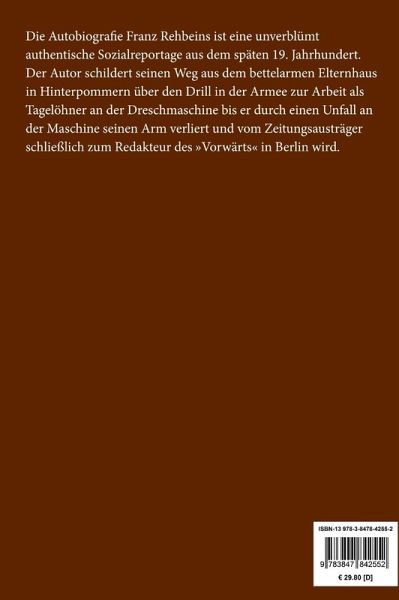 Franz Rehbein: Das Leben eines Landarbeiters Lesefreundlicher Großdruck in 16-pt-Schrift Die Autobiografie Franz Rehbeins ist eine unverblümt authentische Sozialreportage aus dem späten 19. Jahrhundert. Der Autor schildert seinen Weg aus dem bettelarmen Elternhaus in Hinterpommern über den Drill in der Armee zur Arbeit als Tagelöhner an der Dreschmaschine bis er durch einen Unfall an der Maschine seinen Arm verliert und vom Zeitungsausträger schließlich zum Redakteur des »Vorwärts« in Berlin wird. Großformat, 210 x 297 mm Berliner Ausgabe, 2019 Durchgesehener Neusatz bearbeitet und eingerichtet von Theodor Borken Erstdruck: Jena (Diederichs) 1911. Textgrundlage ist die Ausgabe: Rehbein, Franz: Das Leben eines Landarbeiters. Unveränderter Nachdruck der 1911 von Paul Göhre bearbeiteten Ausgabe im Diederichs-Verlag, Herausgegeben und mit einem Nachwort von Urs J. Diederichs und Holger Rüdel, Hamburg: Hans Christians Verlag, 1985. Umschlaggestaltung von Thomas Schultz-Overhage unter Verwendung des Bildes: Jean François Millet, Der Mann mit der Hacke (Ausschnitt), 1862. Gesetzt aus der Minion Pro, 16 pt.