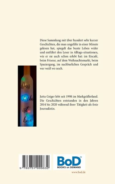 Diese Sammlung mit über hundert sehr kurzer Geschichten, die man ungefähr in einer Minute gelesen hat, spiegelt das bunte Leben wider und entführt den Leser in Alltagssituationen, wie er sie auch schon erlebt hat: Im Eiscafé, beim Friseur, auf dem Weihnachtsmarkt, beim Spaziergang, im nachbarlichen Gespräch und wer weiß wo noch. Oft sind es lustige Situationen, die einen kurz auflachen lassen, dann sind es wieder Anregungen zum Nachdenken oder einfach Momente von denen man denkt, das hätte einem auch passieren können. Die Minutengeschichten spielen rund ums Jahr im sonnenverwöhnten Markgräflerland, wo die Autorin lebt. Sie könnten aber auch sonst überall in Deutschland spielen.