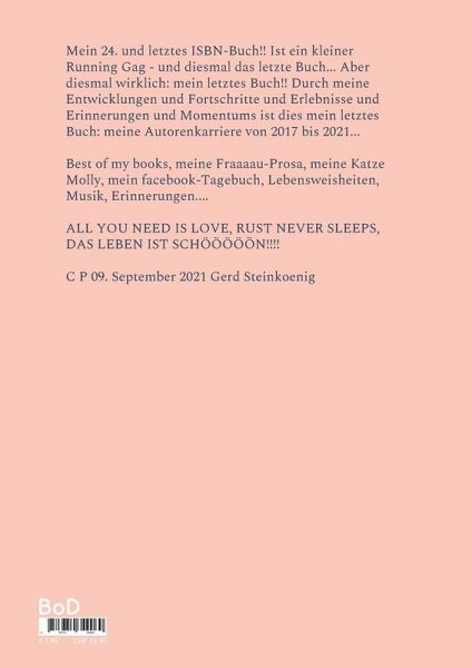 Mein 24. und letztes ISBN-Buch!! Ist ein kleiner Running Gag - und diesmal das letzte Buch... Aber diesmal wirklich: mein letztes Buch!! Durch meine Entwicklungen und Fortschritte und Erlebnisse und Erinnerungen und Momentums ist dies mein letztes Buch: meine Autorenkarriere von 2017 bis 2021... Best of my books, meine Fraaaau-Prosa, meine Katze Molly, mein facebook-Tagebuch, Lebensweisheiten, Musik, Erinnerungen....All You Need Is Love, Rust Never Sleeps, Das Leben Ist Schön!!!!C P 09. September 2021 Gerd Steinkoenig