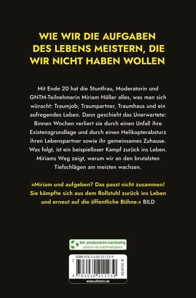 Miriam Höller hat stets am Limit gelebt - bis das Leben ihr harte Grenzen zeigte. Bekannt als eine der wenigen Stuntfrauen Deutschlands, Moderatorin des Motormagazins Grip und Teilnehmerin von Germany's Next Topmodel, war sie schon als Kind eher Wildfang als Prinzessin. Bereits bei ihrer Lebensplanung überlässt sie nichts dem Zufall: Als Teenagerin für ihren Berufswunsch als Stuntfrau belächelt, hat sie mit 18 ihr erstes Profi-Engagement und gründet mit Mitte 20 ihr eigenes Stuntteam. Ihr Markenzeichen wird die einzigartige Kombination von Ästhetik und Action. Doch auch der größte Erfolg schützt nicht vor Ungerechtigkeit. Plötzlich treffen sie zwei Schicksalsschläge nacheinander: Als sie sich bei einem Helikopter-Stunt in High Heels beide Füße bricht, findet ihre Karriere ein jähes Ende. Wenig später stirbt ihr Lebenspartner bei einem Hubschrauberabsturz. Eindringlich und lebensbejahend schildert Miriam Höller, wie sie wieder auf die Beine gekommen ist - und wie wir noch an der schwersten Krise wachsen können.
