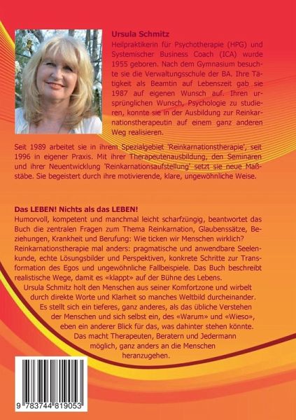 Humorvoll, kompetent und manchmal leicht scharfzüngig, beantwortet das Buch die zentralen Fragen zu den Themen: "Haben wir früher schon einmal gelebt?", Karma aus früheren Leben, Karma in Beziehungen und Aufgabenstellungen aus früheren Leben, Auflösung von Glaubenssätzen. Das Buch zeigt Lösungen für Krankeitsursachen aus früheren Leben auf und die karmische Verquickung von gelebten Fähigkeiten in früheren Leben und dem heutigen Beruf. Wie ticken wir Menschen wirklich? Das ist die zentrale Frage, um sich selbst zu verstehen! Das Buch stellt eine dauerhaft wirksame Reinkarnationstherapie vor: Rückführungen als pragmatische und anwendbare Seelenkunde, echte Lösungsbilder und Perspektiven, konkrete Schritte zur persönlichen Karmaklärung und ausführliche Fallbeispiele. Das Buch beschreibt realistische Wege, damit es «klappt» auf der Bühne des Lebens. Ursula Schmitz holt den Menschen aus seiner Komfortzone und wirbelt durch direkte Worte und Klarheit so manches Weltbild durcheinander. Ziel ist es, den Menschen aus seiner Egofalle zu befreien. Es stellt sich ein tieferes, ganz anderes, als das übliche Verstehen der Menschen und sich selbst ein, des «Warum» und «Wieso», eben ein anderer Blick für das, was dahinter stehen könnte. Das macht Therapeuten, Beratern und Jedermann möglich, ganz anders an die Menschen heranzugehen.