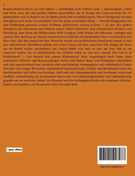 I Romain Rolland hat es vor zehn Jahren ¿ unmittelbar nach Tolstois Tode ¿ unternommen, Leben und Werk eines der drei großen Männer darzustellen, die in Europa den Geist am Ende des 19. Jahrhunderts und zu Beginn des 20. Jahrhunderts tief beeinflußt haben. Dieses Dreigestirn leuchtet und glänzt noch heute unvermindert. Und die junge Generation blickt ¿ obwohl drängendere aus dem Weltkampf geborene soziale Probleme gebieterisch Lösung fordern ¿ zu den drei großen Fanatikern des Erkennens und Fühlens empor. Neben Nietzsche, dem dionysischen Kritiker, und Strindberg, dem durch alle Höllen dieser…mehr