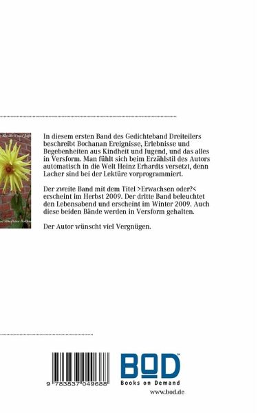 In diesem ersten Band des Gedichteband Dreiteilers beschreibt Bochanan Ereignisse, Erlebnisse und Begebenheiten aus Kindheit und Jugend, und das alles in Versform. Man fühlt sich beim Erzählstil des Autors automatisch in die Welt Heinz Erhardts versetzt, denn Lacher sind bei der Lektüre vorprogrammiert.Der zweite Band mit dem Titel >Erwachsen oder?< erscheint im Herbst 2009. Der dritte Band beleuchtet den Lebensabend und erscheint im Winter 2009. Auch diese beiden Bände werden in Versform gehalten.Der Autor wünscht viel Vergnügen.