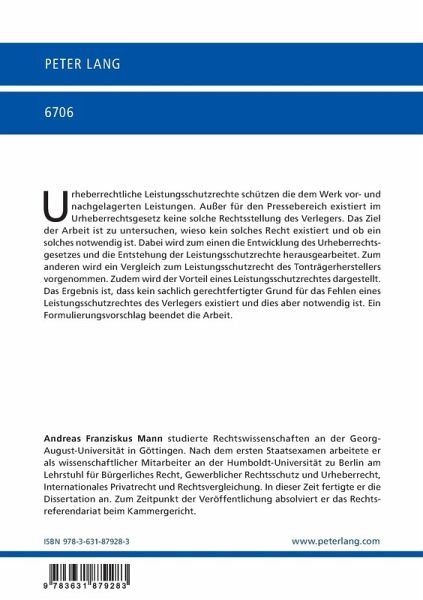 Urheberrechtliche Leistungsschutzrechte schützen die dem Werk vor- und nachgelagerten Leistungen. Außer für den Pressebereich existiert im Urheberrechtsgesetz keine solche Rechtsstellung des Verlegers. Das Ziel der Arbeit ist zu untersuchen, wieso kein solches Recht existiert und ob ein solches notwendig ist. Dabei wird zum einen die Entwicklung des Urheberrechtsgesetzes und die Entstehung der Leistungsschutzrechte herausgearbeitet. Zum anderen wird ein Vergleich zum Leistungsschutzrecht des Tonträgerherstellers vorgenommen. Zudem wird der Vorteil eines Leistungsschutzrechtes dargestellt. Das Ergebnis ist, dass kein sachlich gerechtfertigter Grund für das Fehlen eines Leistungsschutzrechtes des Verlegers existiert und dies aber notwendig ist. Ein Formulierungsvorschlag beendet die Arbeit.