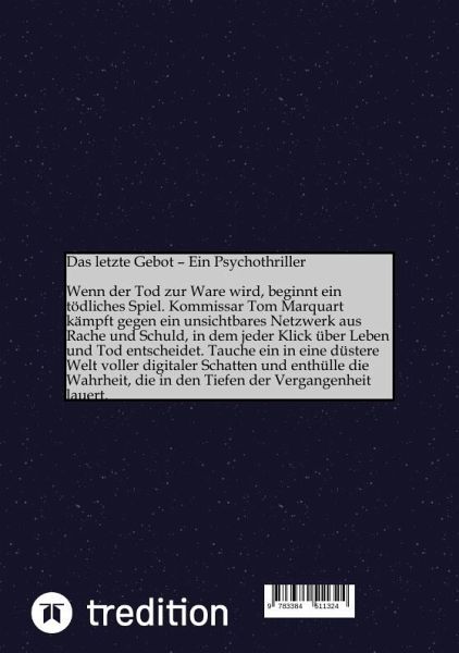 In einer Welt, in der die Grenzen zwischen digitaler Realität und menschlichem Schicksal immer weiter verschwimmen, wird der Tod zur Ware. "Das letzte Gebot" ist ein düsterer Psychothriller, der den Leser in eine abgründige Unterwelt entführt, in der jeder Klick über Leben und Tod entscheidet.Kommissar Tom Marquart, ein abgeklärter Ermittler mit einer schmerzlichen Vergangenheit, stößt auf eine mysteriöse Online-Auktion, bei der das Schicksal unschuldiger Menschen per Mausklick besiegelt wird. Während er sich in den digitalen Schatten eines weitreichenden Netzwerks aus Rache, Schuld und Vergeltung verliert, kämpft Marquart nicht nur gegen einen unsichtbaren Drahtzieher, sondern auch gegen die Dämonen seiner eigenen Vergangenheit.Mit jeder neuen Spur enthüllt sich ein perfides Spiel, in dem alte, jahrhundertealte Pakte und moderne Cyberkriminalität aufeinanderprallen. Verfallene Industriegebäude, geheime Treffen und digitale Codes werden zu den Puzzleteilen eines Systems, das den Preis für menschliches Leid exakt kalkuliert. Zwischen den Zeilen dieser finsteren Machenschaften findet sich - trotz allem - ein zarter Funken Hoffnung, der darauf hinweist, dass selbst in den tiefsten Schatten der Schuld und Rache ein Neuanfang möglich ist."Das letzte Gebot" ist ein fesselnder Thriller, der die Leser dazu einlädt, die dunklen Abgründe moderner Verbrechen zu erkunden und die Wahrheit hinter den digitalen Schatten zu entdecken. Der Roman zeigt eindrucksvoll, dass Gerechtigkeit manchmal mehr bedeutet als Strafe - sie kann auch der erste Schritt zu Versöhnung und Erlösung sein.