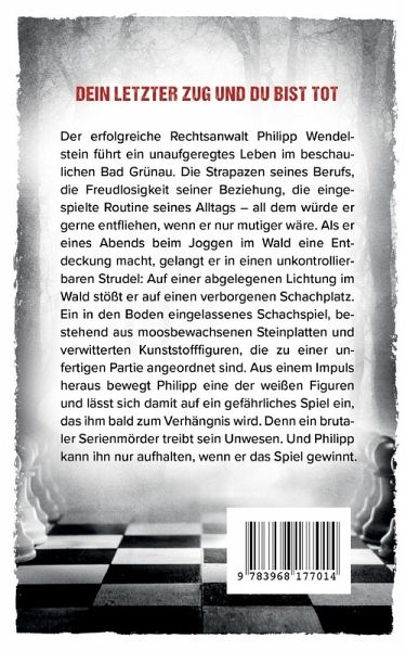 Als der erfolgreiche Rechtsanwalt Philipp Wendelstein eines Abends beim Joggen im Wald eine Entdeckung macht, gerät sein bisher so geordnetes Vorzeige-Leben aus den Fugen. Auf einer abgelegenen Lichtung stößt er auf einen verborgenen Schachplatz. Die verwitterten Kunststofffiguren sind auf den moosbewachsenen Steinplatten zu einer unfertigen Partie angeordnet. Aus einem Impuls heraus bewegt Philipp eine der weißen Figuren und lässt sich damit auf ein gefährliches Spiel ein, denn die Schachzüge haben grausige Auswirkungen auf die Realität: In der Kleinstadt treibt ein perfider Serienmörder sein Unwesen. Und wenn Philipp seine Liebsten schützen und selbst überleben will, dann muss er das Spiel gewinnen