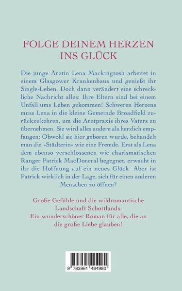 Folge deinem Herzen ins Glück ...Die junge Ärztin Lena Mackingtosh arbeitet in einem Glasgower Krankenhaus und genießt ihr Single-Leben. Doch dann verändert eine schreckliche Nachricht alles: Ihre Eltern sind bei einem Unfall ums Leben gekommen! Schweren Herzens muss Lena in die kleine Gemeinde Broadfield zurückzukehren, um die Arztpraxis ihres Vaters zu übernehmen. Sie wird alles andere als herzlich empfangen: Obwohl sie hier geboren wurde, behandelt man die »Städterin« wie eine Fremde. Erst als Lena dem ebenso verschlossenen wie charismatischen Ranger Patrick MacDoneral begegnet, erwacht in ihr die Hoffnung auf ein neues Glück. Aber ist Patrick wirklich in der Lage, sich für einen anderen Menschen zu öffnen?Große Gefühle und die wildromantische Landschaft Schottlands: Ein wunderschöner Roman für alle, die an die große Liebe glauben!