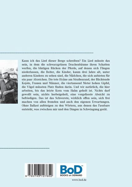 Kann ich das Lied dieser Berge schreiben? Ein Lied müsste das sein, in dem die schwarzgrünen Drachenbäume ihren Schatten werfen, die blutigen Rücken der Pferde, auf denen sich Fliegen niederlassen, die Reiter, die Kinder, kaum drei Jahre alt, unter anderen Kindern zu sehen sind, die Mädchen, die sich anbieten für ein paar Abzeichen. Die tote Hyäne am Straßenrand, der flüchtende Kojote, Frauen und Männer, die viertausend Meter hohen Gipfel, die Vögel müssten Platz finden darin. Und wir natürlich, die hier arbeiten, bis das letzte Korn vom Halm geholt ist. Nichts darf gewollt sein, nichts…mehr