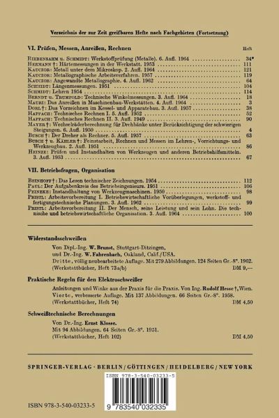 Das Werkstattbuch Heft 43 liegt in der 5. Auflage vor. Seit Erscheinen der 4. Auflage hat sich das Gebiet der SchweiBtechnik im allgemeinen, das des Licht bogenschweiBens insbesondere wesentlich erweitert. Es sind neue Verfahren hinzu gekommen, die alteren Verfahren wurden gerateseitig und vor aHem durch die neuen SchweiBzusatzwerkstoffe erheblich verbessert. Neue Erkenntnisse der Vor gange beim LichtbogenschweiBen erlauben nun die Anwendung auf Arbeiten, die fruher nicht in Betracht gezogen werden konnten. Um durch diese wichtigen Erweiterungen den gegebenen Buchumfang nicht zu uberschreiten, wurden einige Kapitel, die nicht direkt mit dem LichtbogenschweiBen zusammenhangen, ganz fortgelassen. Kurzungen bei der Besprechung der zu schweiBenden Werkstoffe wurden aus dem gleichen Grunde vorgenommen und daffu auf andere Werkstattbucher hingewiesen. Die Zahl der DIN-Blatter, die sich auf das SchweiBen beziehen, hat sich in letzter Zeit so vermehrt, daB die Aufzahlung aller Blatter unmoglich war (s. DIN-Taschenbuch 8 "SchweiBtechnische Normen und Vorschriften") . Es ist zu hoffen, daB das Buch auch in der neuen Auflage Freunde gewinnt. Fur Hinweise und Verbesserungsvorschlage ist der Verfasser stets dankbar. 1. Allgemeine Begriffe 1.1 Schwei8en. Nach DIN 1910 ist MetallschweiBen ein Vereinigen metallischer Werkstoffe unter Anwendung von Warme oder von Druck oder von beiden, und zwar mit oder ohne Zusetzen von artgleichem Werkstoff (Zusatzwerkstoff) mit gleichem oder nahezu gleichem Schmelzbereich. 1.2 Schwei8barkeit. SchweiBbarkeit bedeutet die Fahigkeit eines Werkstoffes, sich unter gegebenen Bedingungen zu einer schweiBgerechten Konstruktion ver schweiBen zu lassen nnd dem Verwendungszweck zu genugen.