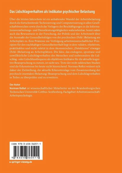 Über die letzten Jahrzehnte ist ein anhaltender Wandel der Arbeitsbelastung durch die fortschreitende Technisierung und Computerisierung in allen Gesellschaftsbereichen sowie durch das Verlagern der Beschäftigungen in die Informationsverarbeitungs- und Dienstleistungstätigkeiten wahrnehmbar. Somit nahm auch das Bewusstsein in der Forschung, der Politik und der Arbeitswelt über die Ausmaße der Gesundheitsfolgen von der psychischen (Fehl-)Belastung am Arbeitsplatz zu. Eine Prämisse zur Verfolgung arbeitswissenschaftlicher Prinzipien für den nachhaltigen Gesundheitserhalt liegt in dem validen, objektiven, praktikablen und nicht zuletzt in dem ökonomischen "Detektieren" etwaiger (Fehl-)Belastung an Arbeitsplätzen. Die Idee, das endogene, spontane und unwillkürliche Lidschlagverhalten des Menschen und insbesondere die Lidschlag- oder Lidschlussfrequenz als objektiven Indikator für die aktuelle kognitive Beanspruchung zu nutzen, ist nicht neu. Trotz der recht zahlreichen Studien sind dieErkenntnisse bis heute nicht hinreichend. Norman Reßut widmet sich daher der Zielstellung, die aktuelle Erkenntnislage vom Zusammenhang der psychisch (mentalen) Belastung/ Beanspruchung und dem Lidschlagverhalten in Teilen zu überprüfen und zu erweitern.