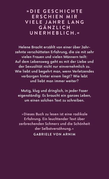 "Dieses Buch zu lesen ist eine radikale Erfahrung. Ein leuchtender Text über zerbrechenden Schmerz und die Schönheit der Selbstversöhnung", so Gabriele von Arnim. Dieses Buch bricht die SchamWas für eine Entdeckung - es braucht ein ganzes Leben, um einen solchen Text zu schreiben. "Die Geschichte erschien mir viele Jahre lang gänzlich unerheblich." Von diesem Satz aus erzählt die heute siebzigjährige Helene Bracht von einer über Jahrzehnte verschütteten Erfahrung, die sie mit sehr vielen Frauen und vielen Männern teilt: der, dass es auf dem Lebensweg mit der Liebe und der Sexualität nicht nur gut und einvernehmlich zuging. Wie liebt und begehrt man, wenn Verletzendes verborgen hinter einem liegt? Wie lebt und liebt man immer weiter? Fulminant ein Tabu brechend und dabei einzigartig gewitzt und souverän erzählt dieser Text vom Missbrauch - und seinen Grenzen. Diese Bilanz wird Denkweisen verändern und vielen Menschen viel bedeuten.