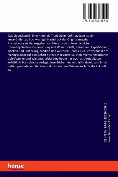 Das Liebeskonzil - Eine Himmels-Tragödie in fünf Aufzügen ist ein unveränderter, hochwertiger Nachdruck der Originalausgabe.Hansebooks ist Herausgeber von Literatur zu unterschiedlichen Themengebieten wie Forschung und Wissenschaft, Reisen und Expeditionen, Kochen und Ernährung, Medizin und weiteren Genres. Der Schwerpunkt des Verlages liegt auf dem Erhalt historischer Literatur. Viele Werke historischer Schriftsteller und Wissenschaftler sind heute nur noch als Antiquitäten erhältlich. Hansebooks verlegt diese Bücher neu und trägt damit zum Erhalt selten gewordener Literatur und historischem Wissen auch für die Zukunft bei.