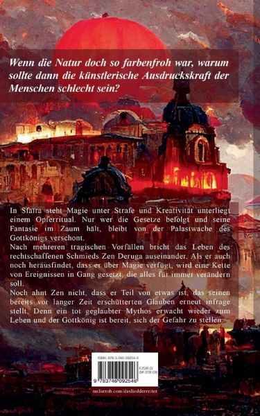 »Wenn die Natur doch so farbenfroh war, warum sollte dann die künstlerische Ausdruckskraft der Menschen schlecht sein?«In Sfaïra steht Magie unter Strafe und Kreativität unterliegt einem Opferritual. Nur wer die Gesetze befolgt und seine Fantasie im Zaum hält, bleibt von der Palastwache des Gottkönigs verschont.Nach mehreren tragischen Vorfällen bricht das Leben des rechtschaffenen Schmieds Zen Deruga auseinander. Als er auch noch herausfindet, dass er über Magie verfügt, wird eine Kette von Ereignissen in Gang gesetzt, die alles für immer verändern soll.Noch ahnt Zen nicht, dass er Teil von etwas ist, das seinen bereits vor langer Zeit erschütterten Glauben erneut infrage stellt. Denn ein tot geglaubter Mythos erwacht wieder zum Leben und der Gottkönig ist bereit, sich der Gefahr zu stellen.Ein High Fantasy Epos über Handwerker, einen Gottkönig und den Kampf um die künstlerische Freiheit.