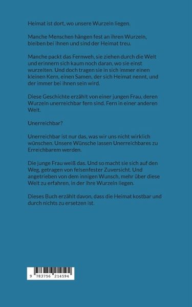Heimat ist dort, wo unsere Wurzeln liegen.Manche Menschen hängen fest an ihren Wurzeln, bleiben bei ihnen und sind der Heimat treu.Manche packt das Fernweh, sie ziehen durch die Welt und erinnern sich kaum noch daran, wo sie einst wurzelten. Und doch tragen sie in sich immer einen kleinen Kern, einen Samen, der sich Heimat nennt, und der immer bei ihnen sein wird.Diese Geschichte erzählt von einer jungen Frau, deren Wurzeln unerreichbar fern sind. Fern in einer anderen Welt.Unerreichbar?Unerreichbar ist nur das, was wir uns nicht wirklich wünschen. Unsere Wünsche lassen Unerreichbares zu Erreichbarem werden.Die junge Frau weiß das. Und so macht sie sich auf den Weg, getragen von felsenfester Zuversicht. Und angetrieben von dem innigen Wunsch, mehr über diese Welt zu erfahren, in der ihre Wurzeln liegen.Dieses Buch erzählt davon, dass die Heimat kostbar und durch nichts zu ersetzen ist.