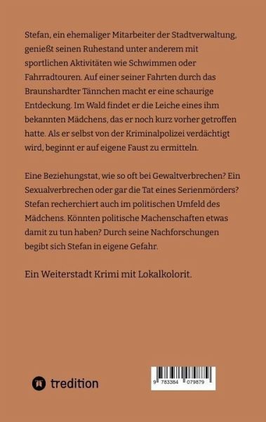Stefan, ein ehemaliger Mitarbeiter der Stadtverwaltung, genießt seinen Ruhestand unter anderem mit sportlichen Aktivitäten wie Schwimmen oder Fahrradtouren. Auf einer seiner Fahrten durch das Braunshardter Tännchen macht er eine schaurige Entdeckung. Im Wald findet er die Leiche eines ihm bekannten Mädchens, das er noch kurz vorher getroffen hatte. Als er selbst von der Kriminalpolizei verdächtigt wird, beginnt er auf eigene Faust zu ermitteln.Eine Beziehungstat, wie so oft bei Gewaltverbrechen? Ein Sexualverbrechen oder gar die Tat eines Serienmörders? Stefan recherchiert auch im politischen Umfeld des Mädchens. Könnten politische Machenschaften etwas damit zu tun haben? Durch seine Nachforschungen begibt sich Stefan in eigene Gefahr.