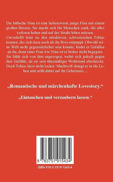 Autorin Sabine Richling für prickelnde Romantik auf www.sabine-richling.com besuchen."Spannender Romantik- / Frauenroman""Eintauchen und verzaubern lassen von diesem verführerischen Erotik - Liebesroman.""Fesselnder Milliardär - Roman zum Wegträumen.Die hübsche Nina ist eine liebenswerte junge Frau mit einem großen Herzen. Sie macht sich für Menschen stark, die alles verloren haben und auf der Straße leben müssen.Unverhofft lernt sie den attraktiven, schwerreichen Tobias kennen, der sich dazu noch als ihr Boss entpuppt. Obwohl seine Welt nicht gegensätzlicher sein könnte, findet er Gefallen an ihr, denn einer Frau wie Nina ist er bisher nicht begegnet.Sie fühlt sich von ihm angezogen, wehrt sich jedoch gegen ihre Gefühle, da sie sein übermäßiger Wohlstand abschreckt. Doch Tobias lässt nicht locker. Machtvoll drängt er in ihr Leben und stößt dabei auf ihr Geheimnis ..."Romantische und märchenhafte Lovestory."