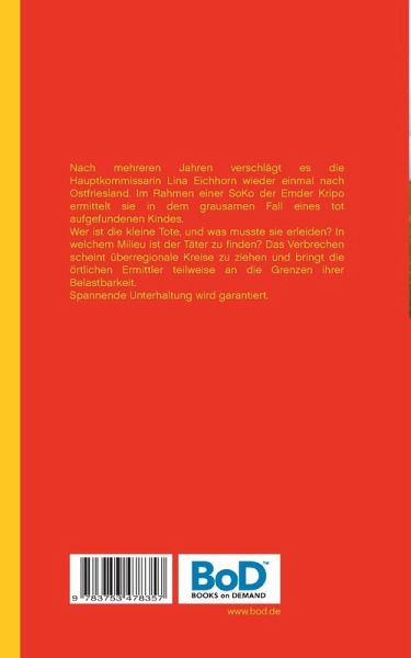Nach mehreren Jahren verschlägt es die Hauptkommissarin Lina Eichhorn wieder einmal nach Ostfriesland. Im Rahmen einer SoKo der Emder Kripo ermittelt sie in dem grausamen Fall eines tot aufgefundenen Kindes. Wer ist die kleine Tote, und was musste sie erleiden? In welchem Milieu ist der Täter zu finden? Das Verbrechen scheint überregionale Kreise zu ziehen und bringt die örtlichen Ermittler teilweise an die Grenzen ihrer Belastbarkeit.Spannende Unterhaltung wird garantiert.