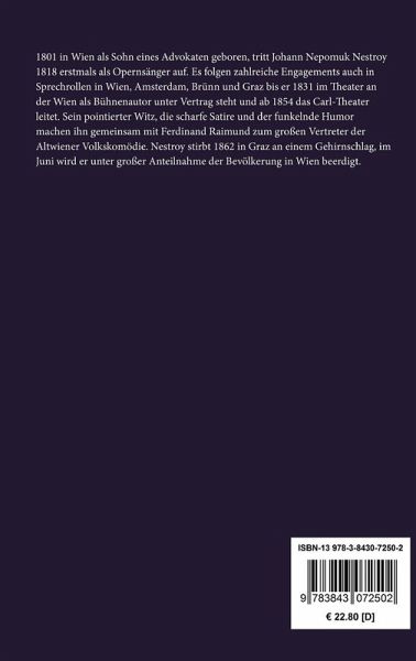 Johann Nestroy: Das Mädl aus der Vorstadt oder Ehrlich währt am längsten. Posse in drei Aufzügen Entstanden 1841. Erstdruck: Wien 1845. Uraufführung am 24.11.1841 in Wien. Vollständige Neuausgabe mit einer Biographie des Autors. Herausgegeben von Karl-Maria Guth. Berlin 2014. Textgrundlage ist die Ausgabe: Johann Nestroy: Werke. Ausgewählt und mit einem Nachwort versehen von Oskar Maurus Fontana, München: Winkler, 1962. Die Paginierung obiger Ausgabe wird in dieser Neuausgabe als Marginalie zeilengenau mitgeführt. Umschlaggestaltung von Thomas Schultz-Overhage unter Verwendung des Bildes: Pierre-Auguste Renoir, Das häkelnde Mädchen, 1875. Gesetzt aus Minion Pro, 11 pt. Über den Autor: 1801 in Wien als Sohn eines Advokaten geboren, tritt Johann Nepomuk Nestroy 1818 erstmals als Opernsänger auf. Es folgen zahlreiche Engagements auch in Sprechrollen in Wien, Amsterdam, Brünn und Graz bis er 1831 im Theater an der Wien als Bühnenautor unter Vertrag steht und ab 1854 das Carl-Theater leitet. Sein pointierter Witz, die scharfe Satire und der funkelnde Humor machen ihn gemeinsam mit Ferdinand Raimund zum großen Vertreter der Altwiener Volkskomödie. Nestroy stirbt 1862 in Graz an einem Gehirnschlag, im Juni wird er unter großer Anteilnahme der Bevölkerung in Wien beerdigt.