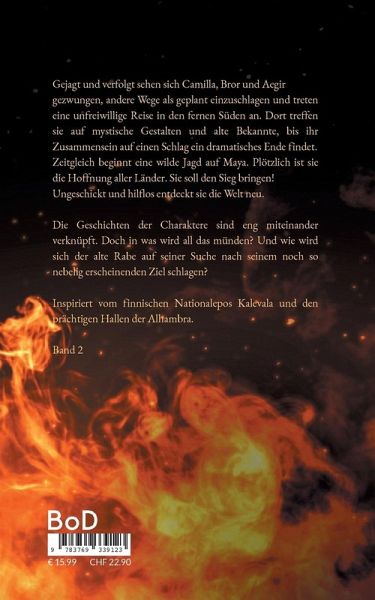 Band 2 - El-Urnans Hexe: Gejagt und verfolgt sehen sich Camilla, Bror und Aegir gezwungen, andere Wege als geplant einzuschlagen und treten eine unfreiwillige Reise in den fernen Süden an. Dort treffen sie auf mystische Gestalten und alte Bekannte, bis ihr Zusammensein prompt ein dramatisches Ende findet. Zeitgleich beginnt eine wilde Jagd auf Maya. Plötzlich ist sie die Hoffnung aller Länder. Sie soll den Sieg bringen! Ungeschickt und hilflos entdeckt sie die Welt neu. Eng miteinander verstrickt sind die Geschichten der Charaktere. Doch in was mündet all das? Und wie wird sich der alte Rabe auf seiner Suche nach seinem noch so nebelig erscheinenden Ziel schlagen? Inspiriert vom finnischen Nationalepos Kalevala und den prächtigen Hallen der Alhambra.