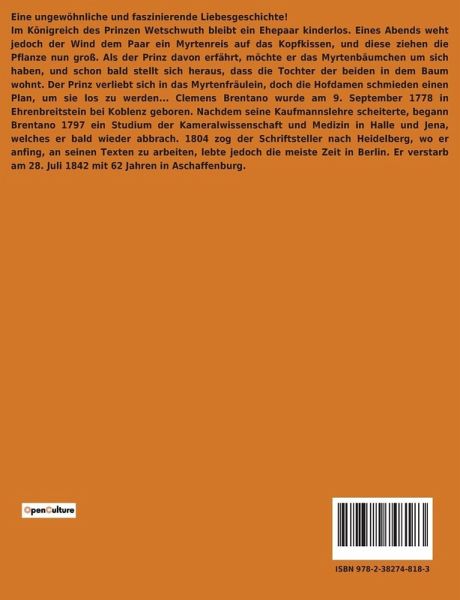 Eine ungewöhnliche und faszinierende Liebesgeschichte! Im Königreich des Prinzen Wetschwuth bleibt ein Ehepaar kinderlos. Eines Abends weht jedoch der Wind dem Paar ein Myrtenreis auf das Kopfkissen, und diese ziehen die Pflanze nun groß. Als der Prinz davon erfährt, möchte er das Myrtenbäumchen um sich haben, und schon bald stellt sich heraus, dass die Tochter der beiden in dem Baum wohnt. Der Prinz verliebt sich in das Myrtenfräulein, doch die Hofdamen schmieden einen Plan, um sie los zu werden... Clemens Brentano wurde am 9. September 1778 in Ehrenbreitstein bei Koblenz geboren. Nachdem seine Kaufmannslehre scheiterte, begann Brentano 1797 ein Studium der Kameralwissenschaft und Medizin in Halle und Jena, welches er bald wieder abbrach. 1804 zog der Schriftsteller nach Heidelberg, wo er anfing, an seinen Texten zu arbeiten, lebte jedoch die meiste Zeit in Berlin. Er verstarb am 28. Juli 1842 mit 62 Jahren in Aschaffenburg.