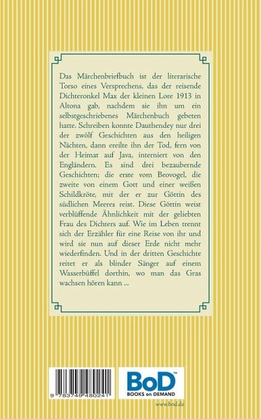 Das Märchenbriefbuch ist der literarische Torso eines Versprechens, das der reisende Dichteronkel Max der kleinen Lore 1913 in Altona gab, nachdem sie ihn um ein selbstgeschriebenes Märchenbuch gebeten hatte. Schreiben konnte Dauthendey nur drei der zwölf Geschichten aus den heiligen Nächten, dann ereilte ihn der Tod, fern von der Heimat auf Java, interniert von den Engländern. Es sind drei bezaubernde Geschichten; die erste vom Beovogel, die zweite von einem Gott und einer weißen Schildkröte, mit der er zur Göttin des südlichen Meeres reist. Diese Göttin weist verblüffende Ähnlichkeit mit der geliebten Frau des Dichters auf. Wie im Leben trennt sich der Erzähler für eine Reise von ihr und wird sie nun auf dieser Erde nicht mehr wiederfinden. Und in der dritten Geschichte reitet er als blinder Sänger auf einem Wasserbüffel dorthin, wo man das Gras wachsen hören kann ...