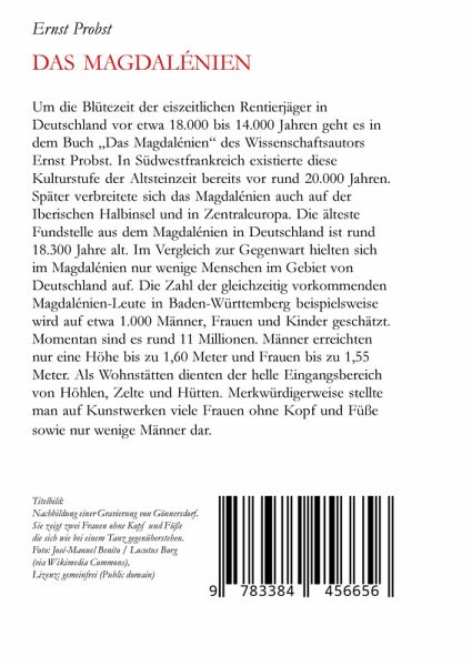 Um die Blütezeit der eiszeitlichen Rentierjäger in Deutschland vor etwa 18.000 bis 14.000 Jahren geht es in dem Buch "Das Magdalénien" des Wissenschaftsautors Ernst Probst. In Südwestfrankreich existierte diese Kulturstufe der Altsteinzeit bereits vor rund 20.000 Jahren. Später verbreitete sich das Magdalénien auch auf der Iberischen Halbinsel und in Zentraleuropa. Die älteste Fundstelle aus dem Magdalénien in Deutschland ist rund 18.300 Jahre alt. Im Vergleich zur Gegenwart hielten sich im Magdalénien nur wenige Menschen im Gebiet von Deutschland auf. Die Zahl der gleichzeitig vorkommenden Magdalénien-Leute in Baden-Württemberg beispielsweise wird auf etwa 1.000 Männer, Frauen und Kinder geschätzt. Momentan sind es rund 11 Millionen. Männer erreichten nur eine Höhe bis zu 1,60 Meter und Frauen bis zu 1,55 Meter. Als Wohnstätten dienten der helle Eingangsbereich von Höhlen, Zelte und Hütten. Merkwürdigerweise stellte man auf Kunstwerken viele Frauen ohne Kopf und Füße sowie nur wenige Männer dar.