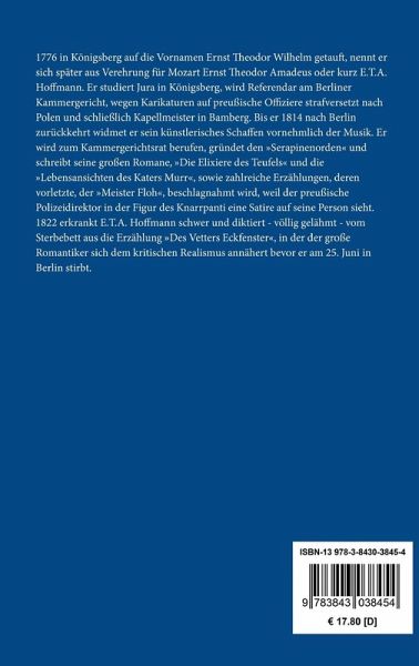 E. T. A. Hoffmann: Das Majorat Erstdruck: Reimer, Berlin, 1817 Vollständige Neuausgabe mit einer Biographie des Autors. Herausgegeben von Karl-Maria Guth. Berlin 2015. Textgrundlage ist die Ausgabe: E.T.A. Hoffmann: Poetische Werke in sechs Bänden, Band 2, Berlin: Aufbau, 1963. Die Paginierung obiger Ausgabe wird in dieser Neuausgabe als Marginalie zeilengenau mitgeführt. Umschlaggestaltung von Thomas Schultz-Overhage unter Verwendung des Bildes: Lev Lagorio, Landsitz, 1892. Gesetzt aus Minion Pro, 11 pt. Über den Autor: 1776 in Königsberg auf die Vornamen Ernst Theodor Wilhelm getauft, nennt er sich später aus Verehrung für Mozart Ernst Theodor Amadeus oder kurz E.T.A. Hoffmann. Er studiert Jura in Königsberg, wird Referendar am Berliner Kammergericht, wegen Karikaturen auf preußische Offiziere strafversetzt nach Polen und schließlich Kapellmeister in Bamberg. Bis er 1814 nach Berlin zurückkehrt widmet er sein künstlerisches Schaffen vornehmlich der Musik. Er wird zum Kammergerichtsrat berufen, gründet den »Serapinenorden« und schreibt seine großen Romane, »Die Elixiere des Teufels« und die »Lebensansichten des Katers Murr«, sowie zahlreiche Erzählungen, deren vorletzte, der »Meister Floh«, beschlagnahmt wird, weil der preußische Polizeidirektor in der Figur des Knarrpanti eine Satire auf seine Person sieht. 1822 erkrankt E.T.A. Hoffmann schwer und diktiert - völlig gelähmt - vom Sterbebett aus die Erzählung »Des Vetters Eckfenster«, in der der große Romantiker sich dem kritischen Realismus annähert bevor er am 25. Juni in Berlin stirbt.