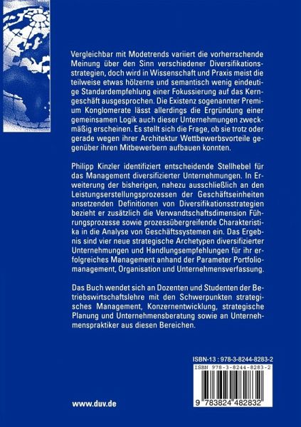 Philipp Kinzler identifiziert entscheidende Stellhebel für das Management diversifizierter Unternehmungen. In Erweiterung der bisherigen, nahezu ausschließlich an den Leistungserstellungsprozessen der Geschäftseinheiten ansetzenden Definitionen von Diversifikationsstrategien bezieht er zusätzlich die Verwandtschaftsdimension Führungsprozesse sowie prozessübergreifende Charakteristika in die Analyse von Geschäftssystemen ein. Das Ergebnis sind vier neue strategische Archetypen diversifizierter Unternehmungen und Handlungsempfehlungen für ihr erfolgreiches Management anhand der Parameter Portfoliomanagement, Organisation und Unternehmensverfassung.