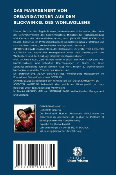 Dieses Buch ist das Ergebnis eines internationalen Kolloquiums, das unter der Schirmherrschaft des Staatsministers, Ministers für Hochschulbildung und Kanzlers der akademischen Orden, Prof. JACQUES FAME NDONGO, in Douala, Kamerun, im Professionalisierungskomplex Campus 2 stattfand und sich mit dem Thema "Wohlwollendes Management" befasste.OPPORTUNE HAND: Organisatorin des Kolloquiums, ihr erster Text beleuchtet ausführlich den Begriff des Managements unter dem Gesichtspunkt des Wohlwollens und der Leistungsfähigkeit von Organisationen.Prof. ISIDORE BIKOKO "Befreit den Kolibri in euch": Der Autor fragt sich, wie Machtstrukturen und kollektive Überzeugungen in Teams zu einer Leistungssteigerung führen können. Dies wirft Fragen zu wohlwollenden Mechanismen und der Theorie des Wandels auf.Dr. BONAVENTURE ABADA behandelt das wohlwollende Management im Kontext von Gesundheitskrisen COVID 19.DAWAYE EGUESSA behandelt den Führungsstil als GUTER FAMILIENVATER. ADEDOYIN AMANGBO behandelt den weiblichen Führungsstil und das Regieren unter dem Aspekt des Wohlwollens.M. Dimitri M'FOUMOU-TITI und STEPHANE BAPIA: Wohlwollendes Management und Leistung.