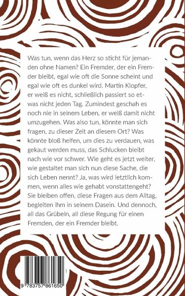 Was tun, wenn das Herz so sticht für jemanden ohne Namen? Ein Fremder, der ein Fremder bleibt, egal wie oft die Sonne scheint und egal wie oft es dunkel wird. Martin Klopfer, er weiß es nicht, schließlich passiert so etwas nicht jeden Tag. Zumindest geschah es noch nie in seinem Leben, er weiß damit nicht umzugehen. Was also tun, könnte man sich fragen, zu dieser Zeit an diesem Ort? Was könnte bloß helfen, um dies zu verdauen, was gekaut werden muss, das Schlucken bleibt nach wie vor schwer. Wie geht es jetzt weiter, wie gestaltet man sich nun diese Sache, die sich Leben nennt? Ja, was wird letztlich kommen, wenn alles wie gehabt vonstattengeht? Sie bleiben offen, diese Fragen aus dem Alltag, begleiten ihm in seinem Dasein. Und dennoch, all das Grübeln, all diese Regung, für einen Fremden, der ein Fremder bleibt.
