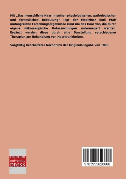 Mit Das menschliche Haar in seiner physiologischen, pathologischen und forensischen Bedeutung legt der Mediziner Emil Pfaff umfangreiche Forschungsergebnisse rund um das Haar vor, die durch eigene mikroskopische Untersuchungen untermauert werden. Ergänzt werden diese durch eine Darstellung verschiedener Therapien zur Behandlung von Haarkrankheiten.
