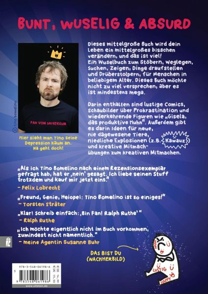 Dieses mittelgroße Buch wird Ihr Leben ein mittelgroßes bisschen verändern, und das ist viel! Ein Wuselbuch zum Stöbern, Weglegen, Suchen, Zeigen, Dingedraufstellen und Drüberstolpern, für Menschen in beliebigem Alter. Dieses Buch möchte nicht zu viel versprechen, aber es ist mindestens mega. Darin enthalten sind lustige Comics, Schaubilder über Prokrastination, wiederkehrende Figuren wie "Gisela, das produktive Huhn". Außerdem gibt es darin Ideen für neue, nie dagewesene Tiere, niedliche Explosionen (z.B. "Kawauz") und kreative Mitmachübungen zum kreativen Mitmachen.