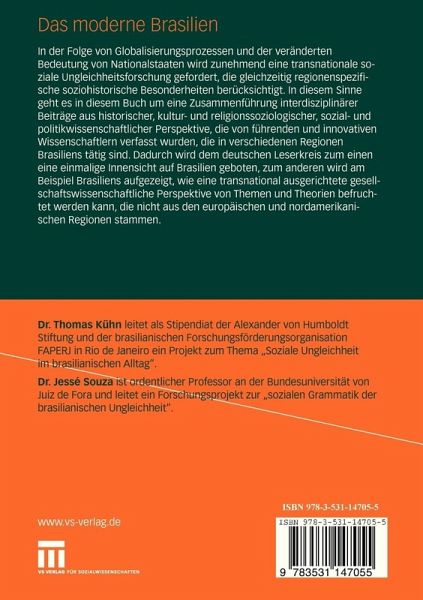 In der Folge von Globalisierungsprozessen und der veränderten Bedeutung von Nationalstaaten wird zunehmend eine transnationale soziale Ungleichheitsforschung gefordert, die gleichzeitig regionenspezifische soziohistorische Besonderheiten berücksichtigt. In diesem Sinne geht es in diesem Buch um eine Zusammenführung interdisziplinärer Beiträge aus historischer, kultur- und religionssoziologischer, sozial- und politikwissenschaftlicherPerspektive, die von führenden und innovativen Wissenschaftlern verfasst wurden, die in verschiedenen Regionen Brasiliens tätig sind. Dadurch wird dem deutschen Leserkreis zum einen eine einmalige Innensicht auf Brasilien geboten, zum anderen wird aufgezeigt, wie eine transnational ausgerichtete gesellschaftswissenschaftliche Perspektive von Themen und Theorien befruchtet werden kann, die nicht aus den europäischen und nordamerikanischen Regionen stammen.