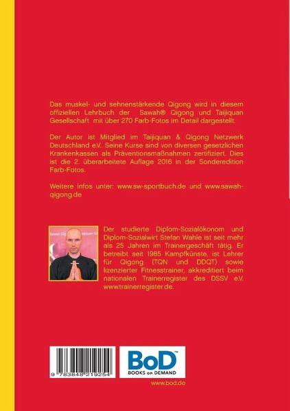 Das muskel- und sehnenstärkende Qigong wird in diesem offiziellen Lehrbuch der Sawah® Qigong und Taijiquan Gesellschaft mit über 270 Farb-Fotos im Detail dargestellt. Jeder kleine Zwischenschritt ist erkennbar und auch für Anfänger nachvollziehbar. Ergänzt wird das Ganze durch ausführlich erklärende Texte. Qigong beinhaltet Übungen, die den Energiefluss im Körper fördern und Blockaden lösen, um die Gesundheit zu erhalten, zu fördern oder wiederzuerlangen. Sie sind daher für kranke sowie für gesunde Menschen gleichermaßen geeignet und sinnvoll.Dies ist die 2. überarbeitete Auflage 2016 in der Sonderedition Farb-Fotos.Der Legende nach kam um 500 n.Chr. der buddhistische Mönch Bodhidharma (Gründer des Zen-Buddhismus in China) aus Indien nach China und meditierte dort in einer Höhle des Berges Song in der Nähe des Shaolin Klosters neun Jahre lang. Danach unterrichtete er die Mönche des Klosters in den Übungen des Yi Jin Jing. Dies sollte dem Ausgleich der Belastungen stundenlanger Meditation und damit der Stärkung der Konstitution sowie des Erhaltens eines wachen Geistes dienen. Auch bei diesen speziellen Qigong-Übungen geht es um das Prinzip des An- und Entspannens von unterschiedlichen Muskeln, um den Fluss des Blutes und des Qi im Körper anzuregen. Die Muskeln werden des Weiteren gedehnt, wodurch sich die Beweglichkeit verbessert. Die hier vorgestellte Variante ist an die offiziell vom chinesischen Sportministerium autorisierte Form angelehnt.Weitere Infos unter: www.sw-sportbuch.de und www.sawah-qigong.deDer studierte Diplom-Sozialökonom und Diplom-Sozialwirt Stefan Wahle ist seit 30 Jahren im Trainergeschäft tätig. Er betreibt seit 1985 Kampfkünste, ist Lehrer für Qigong (BVTQ und DDQT) sowie lizenzierter Fitnesstrainer.Stefan Wahle hat bereits diverse Sportratgeber veröffentlicht und ist Mitglied in der Bundesvereinigung für Taijiquan und Qigong e.V.. Seine Qigong-Kurse sind von den gesetzlichen Krankenkassen im Rahmen der Prävention anerkannt.