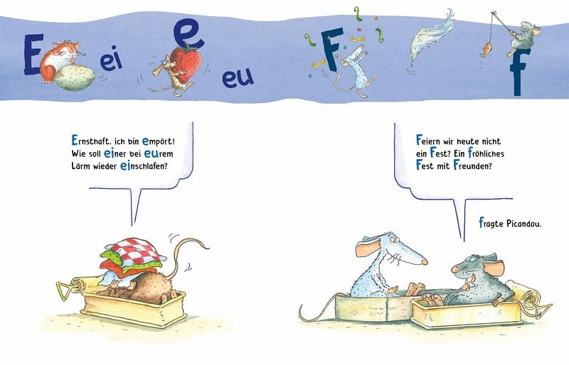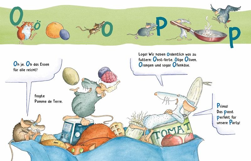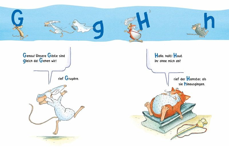 Das Alphabet wird mit einer herrlich bunten Wortwahl vorgestellt, dabei laufen im oberen Drittel der Buchseite wie auf einer Banderole die Buchstaben in groß und klein ab. Es werden auch gängige Silben und Verbindungen der Buchstaben wie "ä", "äu" oder "ch" gezeigt, die von den tierischen Helden gezogen, geschleppt und irgendwie begleitet werden.